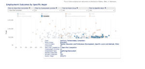 Every visualization can be decomposed into two different parts – marks and channels. Marks are the geometric primitives that represent items or links (points, lines, arrows). Channels are the visual representation of item attributes (position, color, shape or tilts). And then consider what adjustments need to be made to facilitate understanding such as scale transformations, how to deal with outliers, set limits on the coordinates. In the education-employment use case, the state agency staff knew that decision-makers were interested in the earnings and employment degree completers. The visual maps wages against the percent employed by major – carefully defining percent employed as 3 years post completion (telling the truth). The data primitive is the point for each major. The channel is the color which shows the different majors. In this case, blue shows the outcomes for education majors. The immediate effect of the visual is to show that there are very big differences in employment and earnings by major and that if “good majors” are defined by jobs with high earnings, health is a good major. Education is in the middle of the pack. What is compelling about the graphic is that it provides decision-makers with control. They can click on a circle to get more information about the major, and they can click on the filters to customize what they see. READ MORE